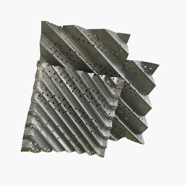 金屬孔板波紋填料是在金屬薄板表面開孔、軋制小紋、大波紋最后組裝而成的規整填料,具有阻力小、氣液布均勻、效率高、能量大、放大效應不明顯等特點,應用于負壓、常壓和加壓操作。